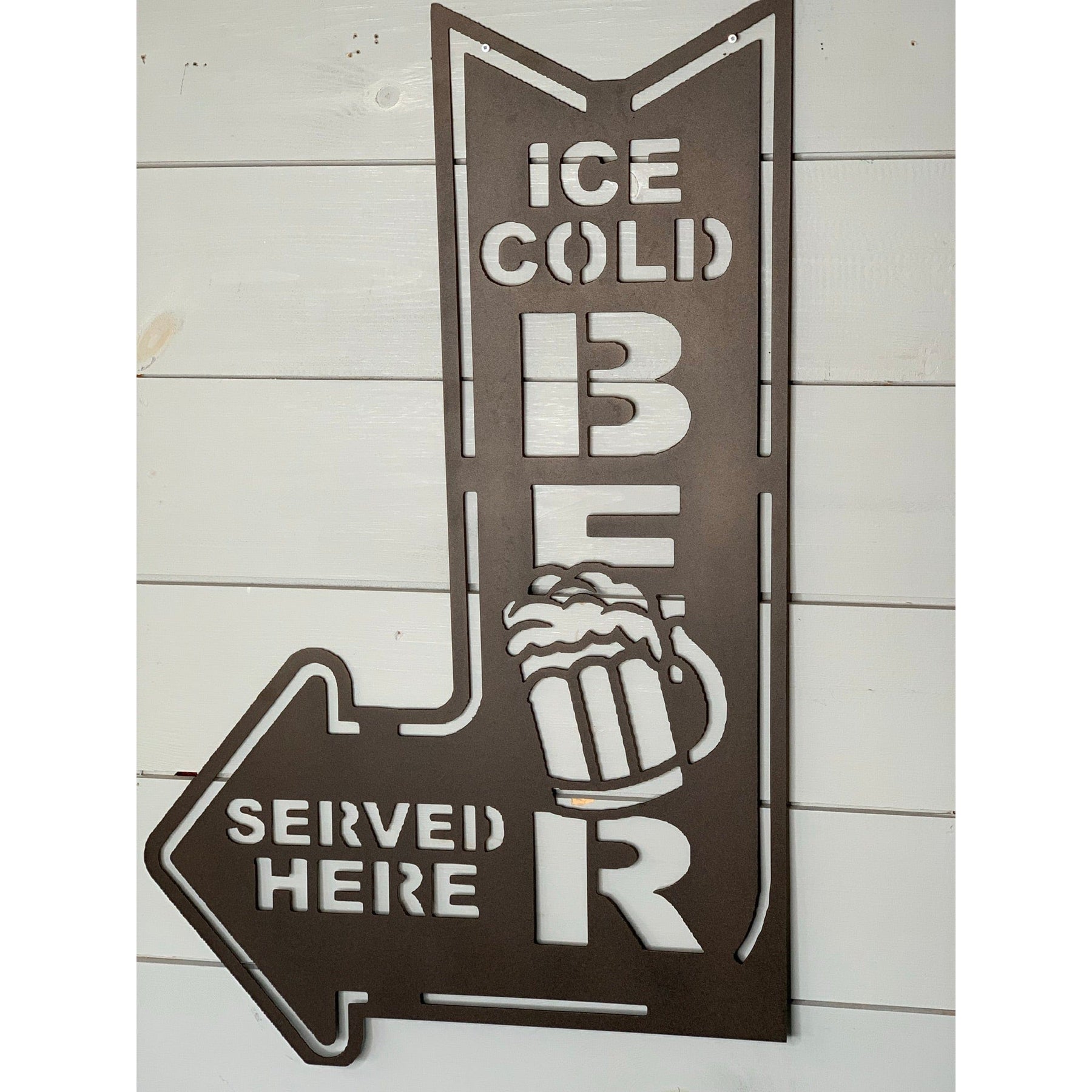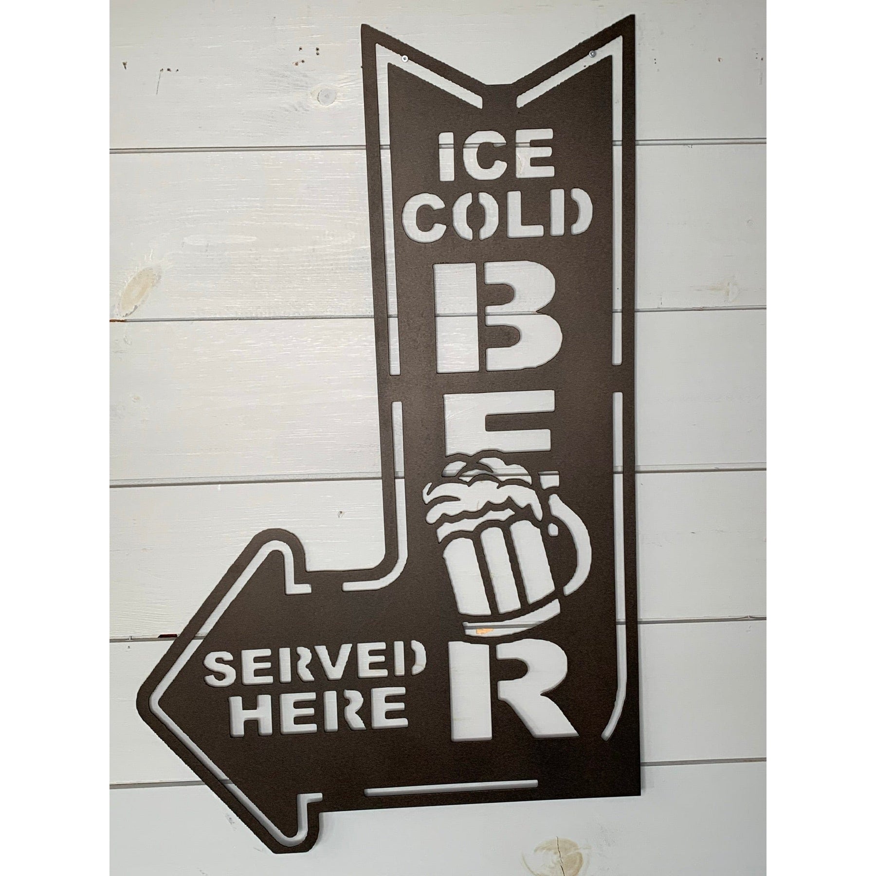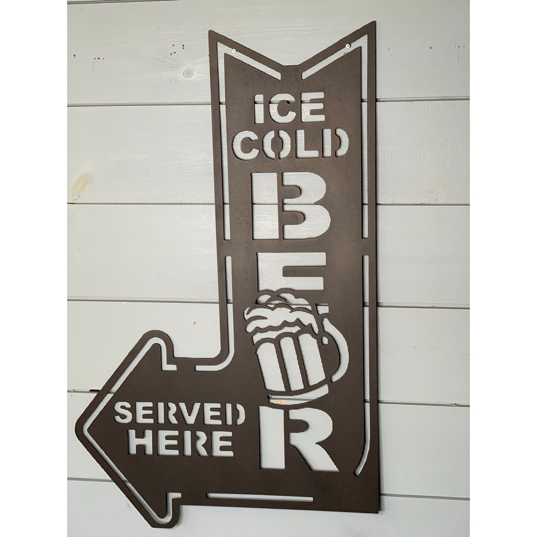 "Direct your guests to the best spot in the house with this eye-catching metal sign. The bold and bright design features the words "Ice Cold Beer Here" emblazoned across the sign, with a pointed arrow pointing the way. The sign is made from durable metal, ensuring it can withstand the wear and tear of everyday use. Hang it on a wall, door, or fence to lead the way to your home's designated beverage station. Whether you're hosting a party or just relaxing at home, this metal sign is sure to be a hit with all your friends and family. So why wait? Get your hands on this fun and functional metal sign today!"