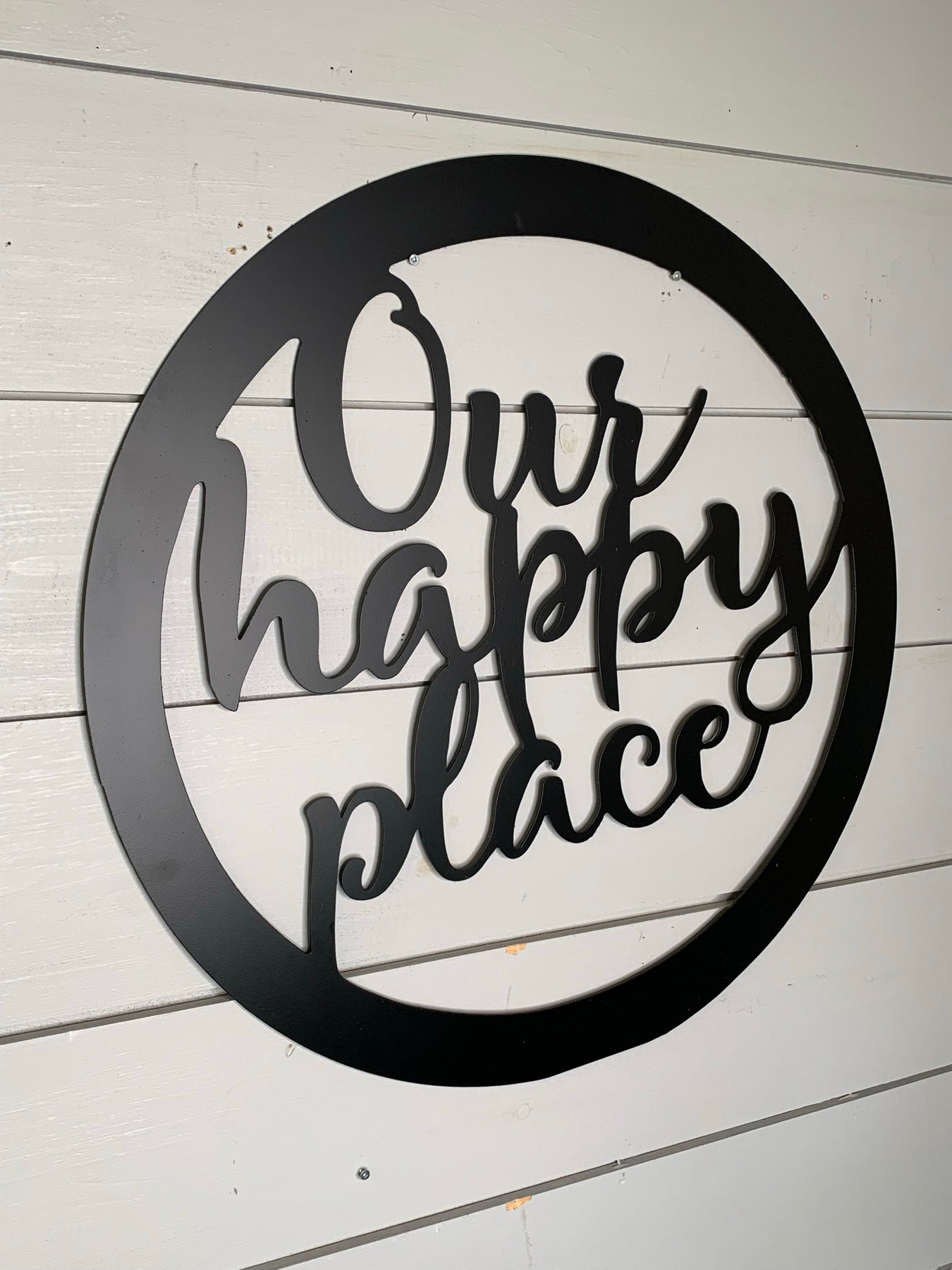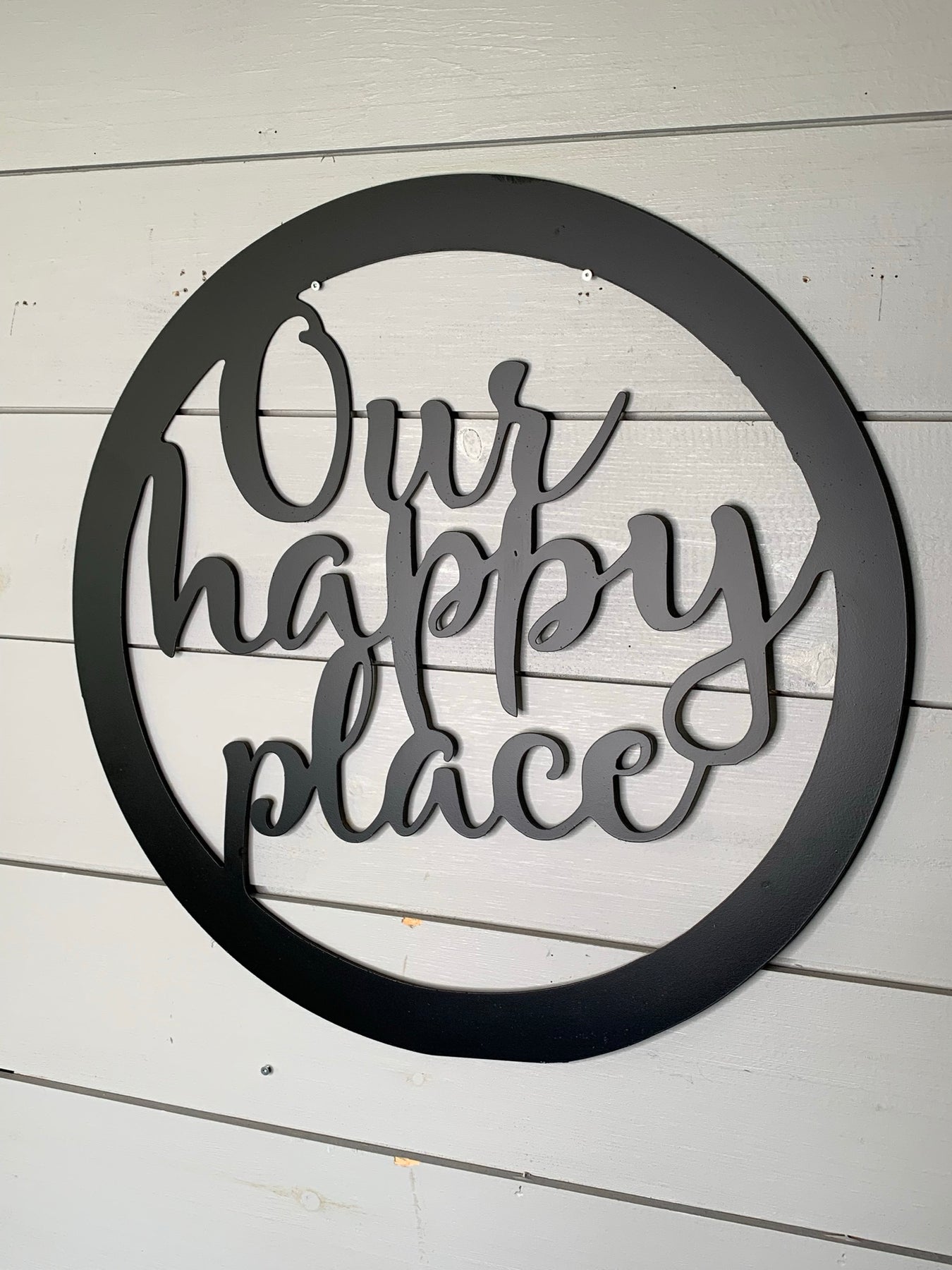 The "Our Happy Place" metal sign is expertly crafted from durable metal, designed to enhance any room with a sophisticated yet inviting message. Its robust construction ensures longevity, suitable for both indoor and outdoor display. Ideal for adding a personalized, warm touch to your living or workspace, this sign delivers a tasteful blend of style and sentiment that stands the test of time.